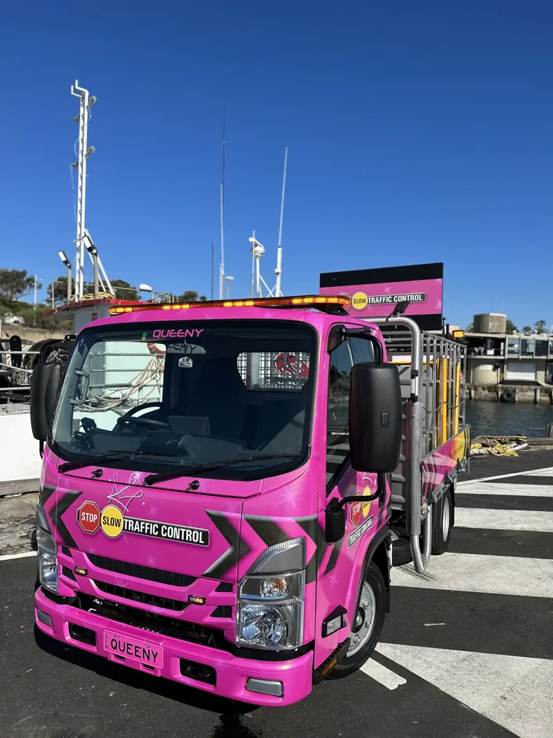 This hot pink Isuzu number sure stands out from the crowd while hard at work for Stop Slow Traffic Control.