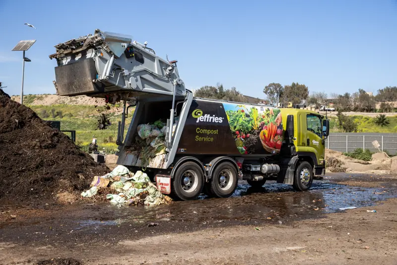 One of the Jeffries' Isuzu FVY 240-300 green waste compactor trucks collecting organic matter