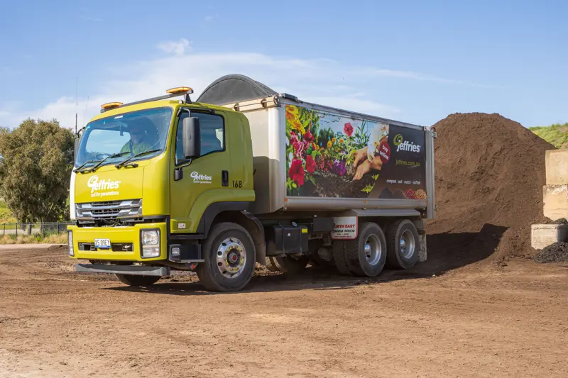 The versatility offered by their Isuzu fleet is vital to the smooth running of the operation. Those trucks fitted with a compactor body collect organic material from grocery stores and produce suppliers, compacted on-board for eventual processing at the Jeffries’ facility. This material is then processed to become compost, soil, mulch and fertilisers to be used at farms and vineyards across South Australia.