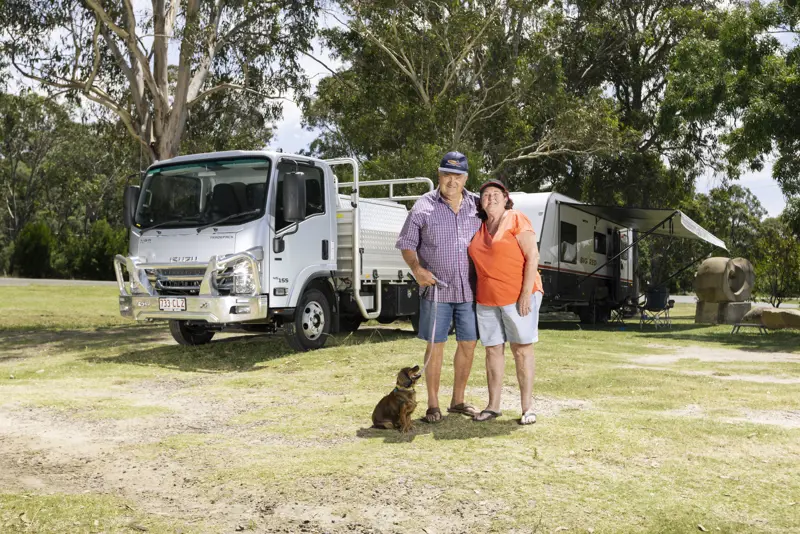 After retiring from managing motels and caravan parks in Queensland's Scenic Rim, Helen and Greg Gault decided to purchase a light-duty truck for towing their New Age Big Red 22-foot caravan and carry everything they need to operate self-sufficiently on the road.