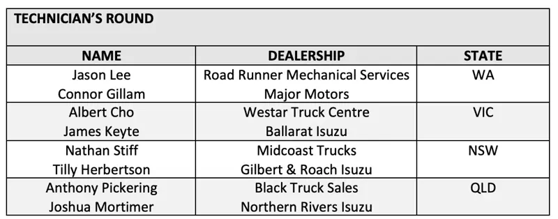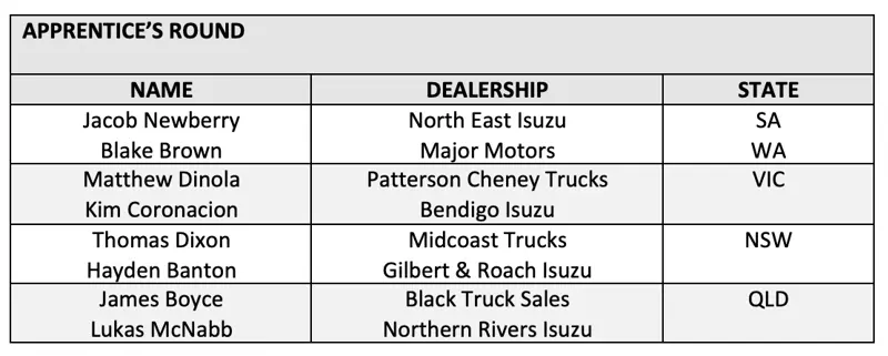 The two top scoring contestants from the apprentice round were Matthew Dinola from Patterson Cheney Trucks in Victoria and Kim Coronacion from Bendigo Isuzu.