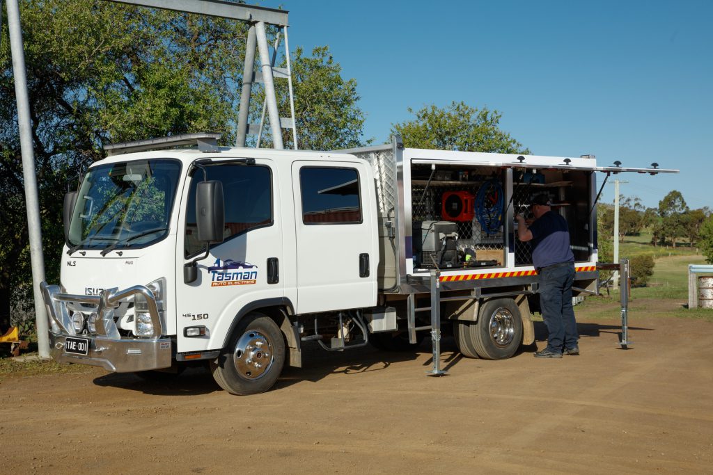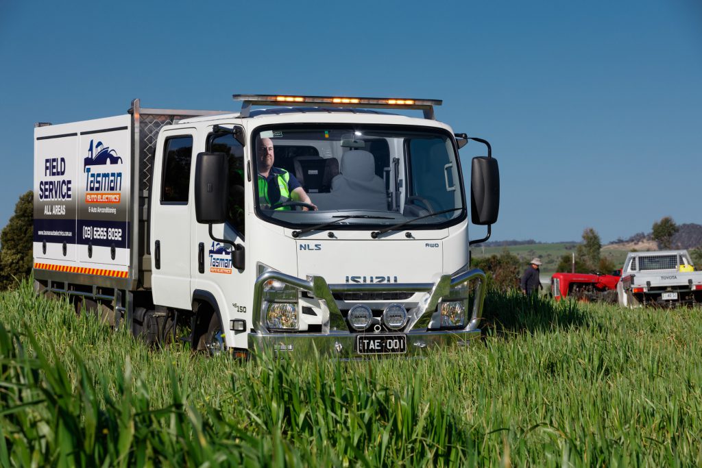 Although it’s the commercial and rural clients, working in sectors like agriculture, earthworks and emergency services that call for Tasman’s specialised knowledge of heavy machinery and auto electrics—and the capability of Nick’s Isuzu All Wheel Drive Crew (AWD), complete with a unique, removable service body.