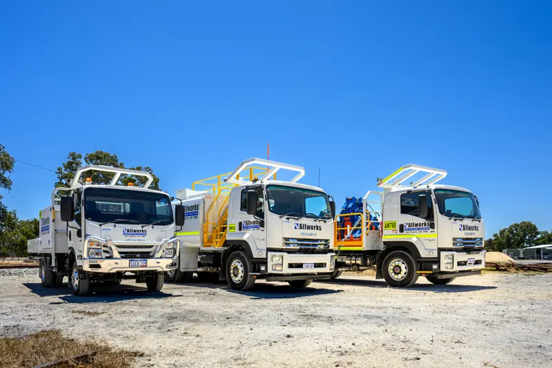 On the transport side of the offering, Allworks has over 40 Isuzu trucks in its fleet. They operate over a dozen water-carting trucks, 15 crew cab models in both F Series and N Series guises, five FVZ and FXZ 240-350 tipper trucks, half a dozen service trucks, and more.